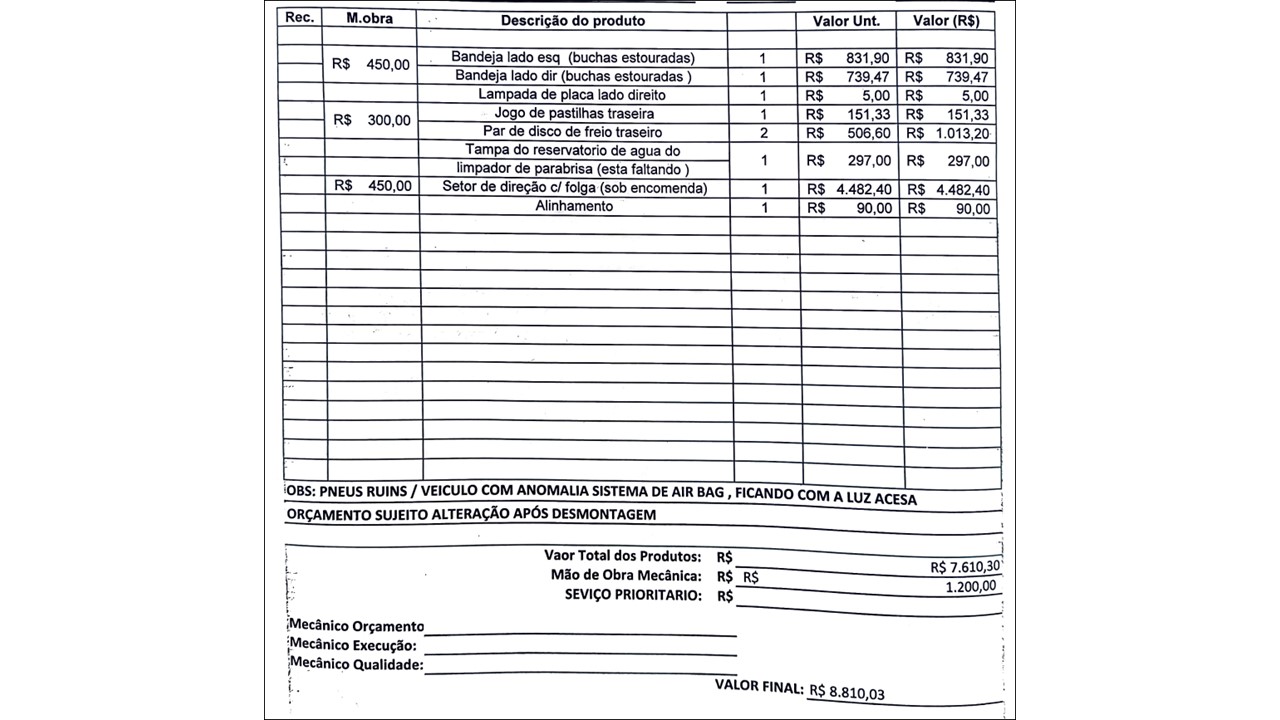 Conversando com profissionais das 3 oficinas, a análise apresentada pelos técnicos da Bono Oficina e da Oficina GW é muito parecida, e com itens no orçamento muito parecidos. O discurso e o orçamento da Oficina Renaumec está muito diferente das outras duas oficinas.